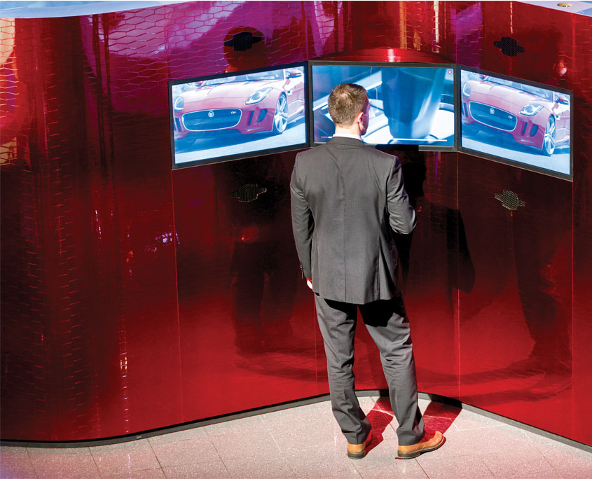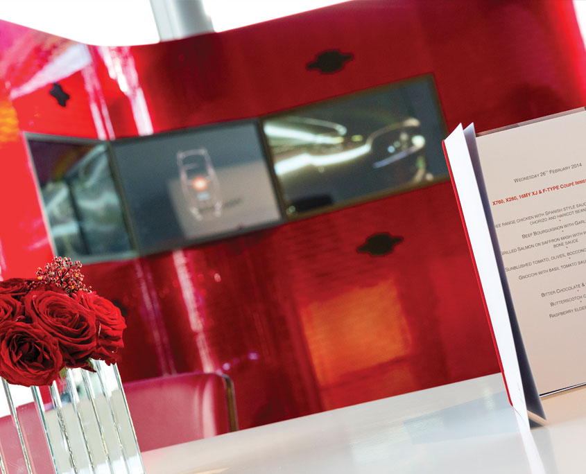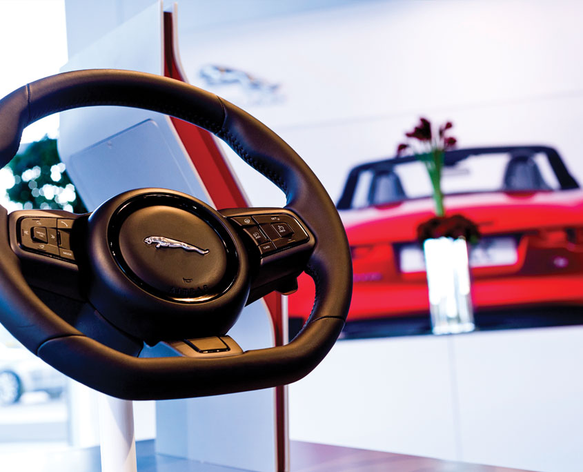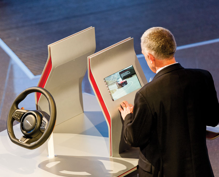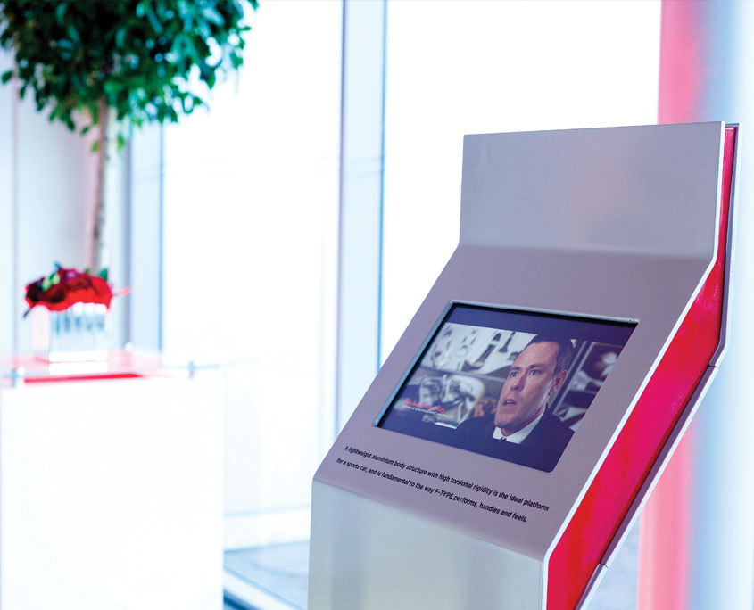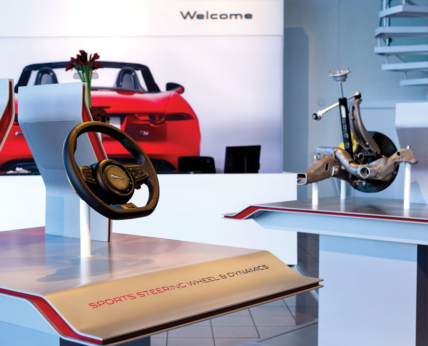 Jaguar’s F-TYPE Technology Tour kit; a one off kit built to showcase the advanced technology of the vehicle through digital content and physical assets. The kit comprised of 3 component tables; Active Differential, Sports Steering Wheel & Dynamics and Carbon Ceramic Braking System, an aluminium versus steel totem and a 2.2m x 3.2m lacquered, lozenge detail engine wall.
