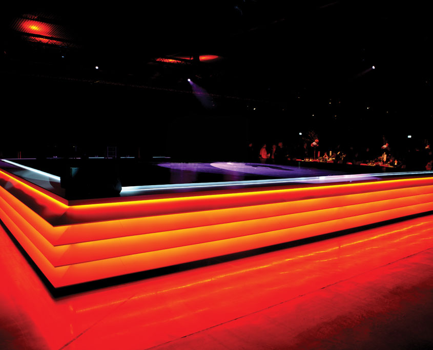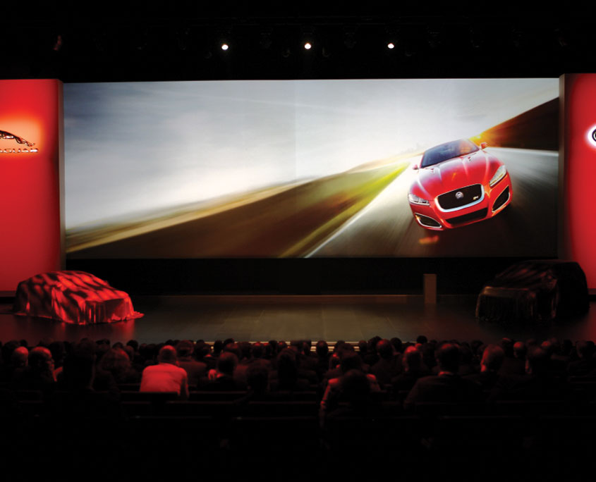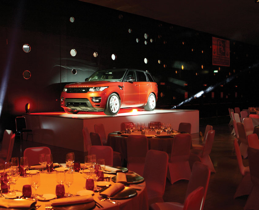 The 3 main areas of the Internacional’s unique space was utilised to create distinctive environments for dining, guest presentations, training and vehicle displays. Our stock scenic walling was installed to divide the overall space and support over 250m2 of full colour canvas prints. A 4 car reveal on the main stage was supported by a 21m x 8m floor to ceiling rear projection screen and an LED illuminated central stage was built to emulate a flamenco dancer’s skirts for the evening’s entertainment.