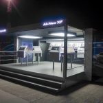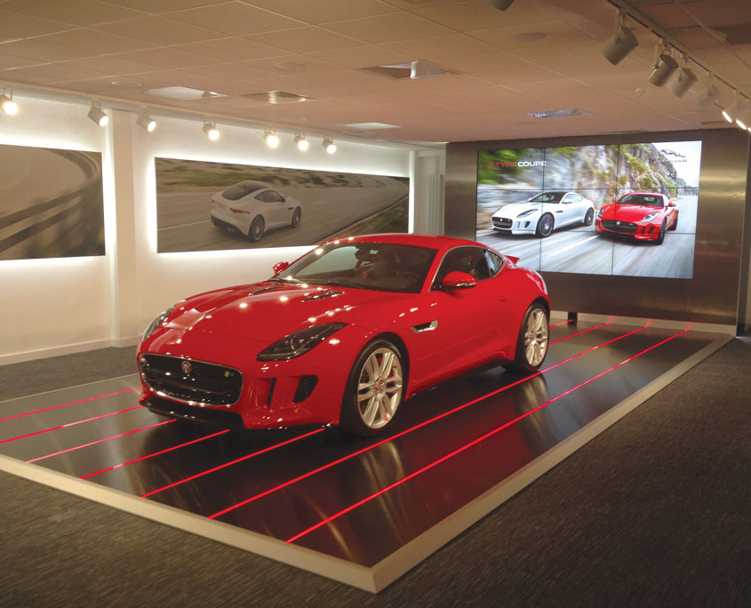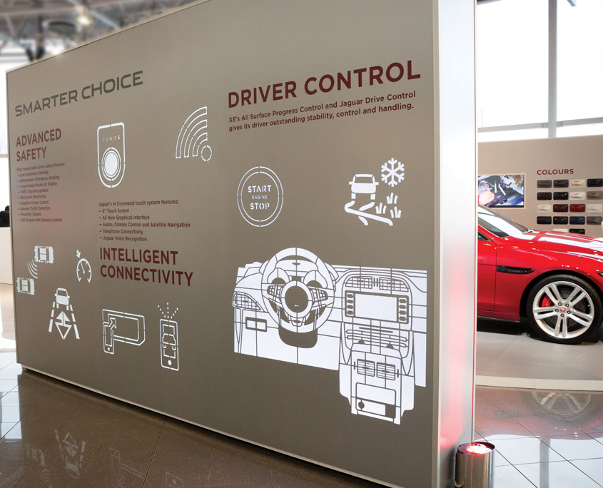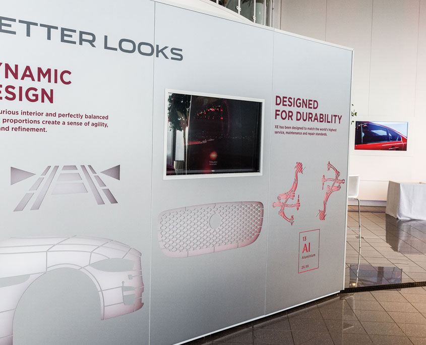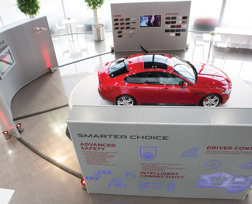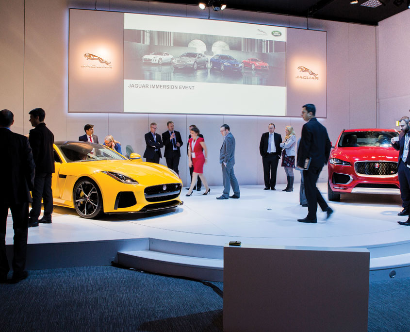Hosted at Jaguar Land Rover’s Castle Bromwich site the event required a main presentation suite for 160 guests with extended stage to accommodate a 2 car reveal. 4 breakout areas were dressed and the venues showroom was transformed at various points throughout the programme to become a viewing studio for vehicles, a dining area and finally to exhibit an XE Preview Kit. This consisted of a 7m elliptical vehicle plinth, an 11m curved display wall showcasing the vehicles personalisation options; 18 exterior colours, 8 finishers, 18 trim levels, and 3 interactive screens.
