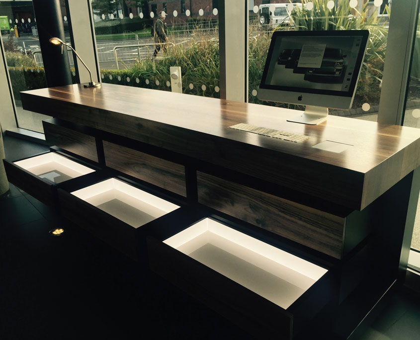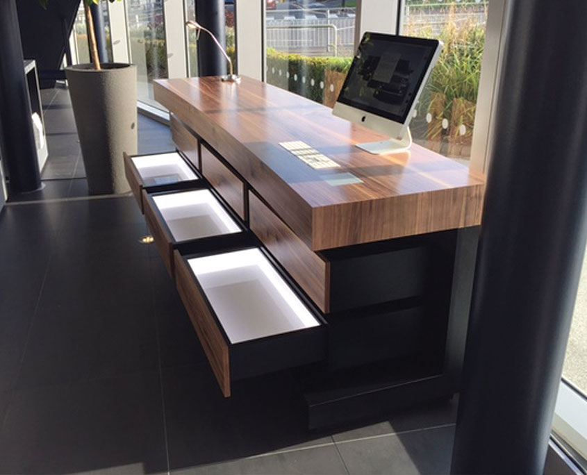 A bespoke configuration unit commissioned to assist guests when building their vehicle to their own personal specification. The main unit constructed using American Walnut veneer and black laminate follows the gentle curve of the Visitor Centre and houses 42 external colour assets and 8 finishers in