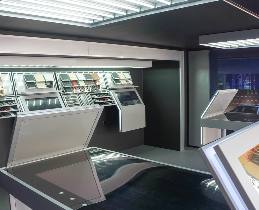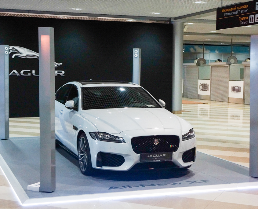 A global programme to provide an experiential introduction to the New XF. 3 indoor kits and 4 mobile kits were constructed to support both indoor and outdoor local marketing activity. The indoor guest experience consisted of a series of passive and interactive elements to engage with: vehicle reveal, bespoke colour and material unit including touchscreen configurator, 4 environmental graphic walls, an interactive technology window and 4 interactive displays screens while the outdoor experience consisted of the same colour and material and interactive displays mounted within a mobile exhibition trailer and an external vehicle feature.